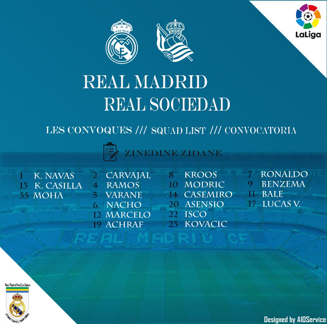 Blessés, Vallejo, Marcelo, Theo, Kroos, Kovačić et Benzéma sont absents. Achraf et Tejero ont été retenus par le coach madrilène.